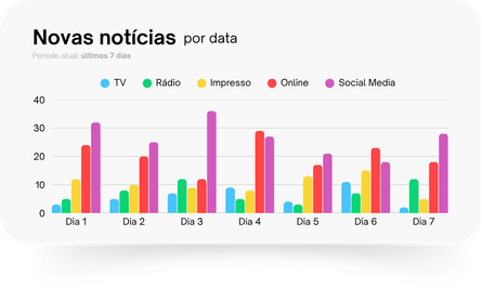 Identifique riscos, compare presença com concorrentes, acompanhe picos de exposição e descubra quais temas e regiões estão influenciando a percepção sobre a sua marca.